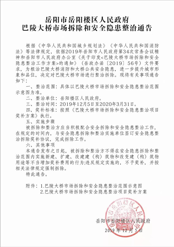 巴陵大桥市场地处我市中心城区东茅岭商圈,系1984年依大桥南北两侧而建的一个综合性市场,主要由桥下市场、桥南市场和桥北市场三部分组成。市场依桥而建,门店摊位密集,道路交通拥堵,占用消防车道,防火间距不足,公共消防设施增设受限,影响消防扑救面,存在重大安全隐患。2000年4月8日,小龙城曾因消防问题发生特大火灾,造成重大财产及其他损失;2016年8月,被省政府湘政办〔2016〕118号明电列为区域性火灾隐患实施挂牌督办。同时,巴陵大桥是我市城区贯通东西的交通动脉,车流人流昼夜穿梭不息,且京广铁路自北向南从桥下穿过,地理位置十分重要和敏感,大桥建成30多年来,桥体从未加固维修,一旦发生安全事故,必将造成重大人员伤亡和财产损失,几十年的安全发展将毁于一旦,后果难以想象。此外,巴陵大桥市场目前经营的档次与品位与所处的东茅岭步行街商圈区位发展及岳阳全国文明城市、国家卫生城市、大城市建设战略定位极不匹配,成为我市发展的一个“痛点”和“堵点”。