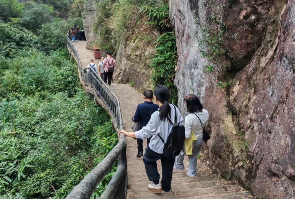 抵达石牛寨后,大家在专业人员引导下开启探秘之旅。明代古兵寨城墙的沧桑、高空玻璃桥的惊险、绝壁栈道的奇峻、悬崖天眼的壮阔,搭配秋日里绚烂的百里丹霞风光,让大家沉浸式感受“天下第一寨”的独特魅力。游览途中,“秋韵石牛寨”主题摄影分享同步进行,大家纷纷用镜头捕捉自然美景与同事笑颜,交流拍摄心得,定格美好瞬间。
