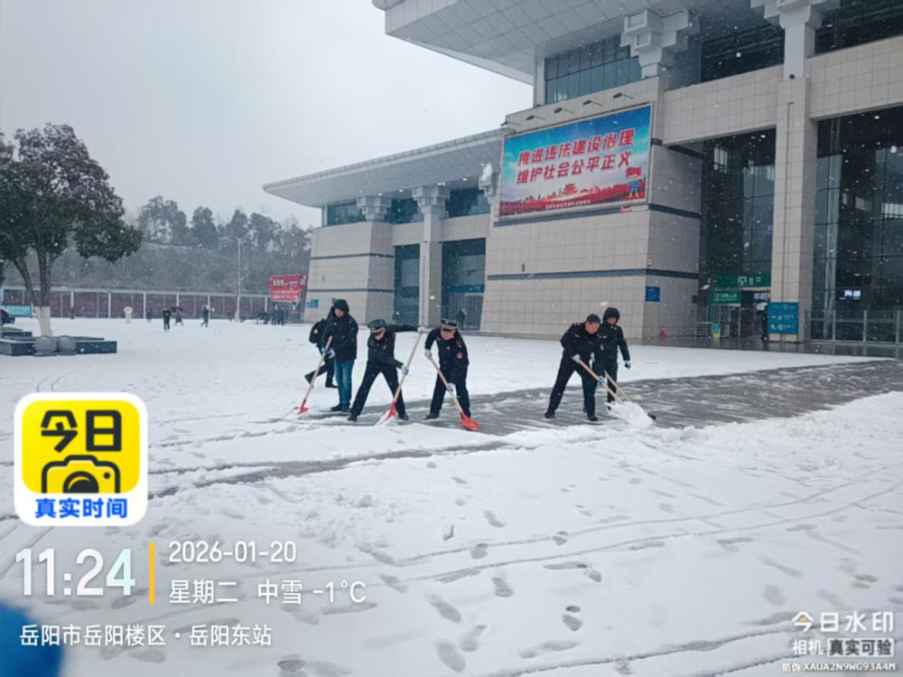 针对岳阳火车站和岳阳东站等重点窗口区域,支队清除积雪积冰、铺设防滑设施,并积极协助旅客安全出行,为有需要的群众提供出行帮助,在寒冬中传递城管人的温暖。