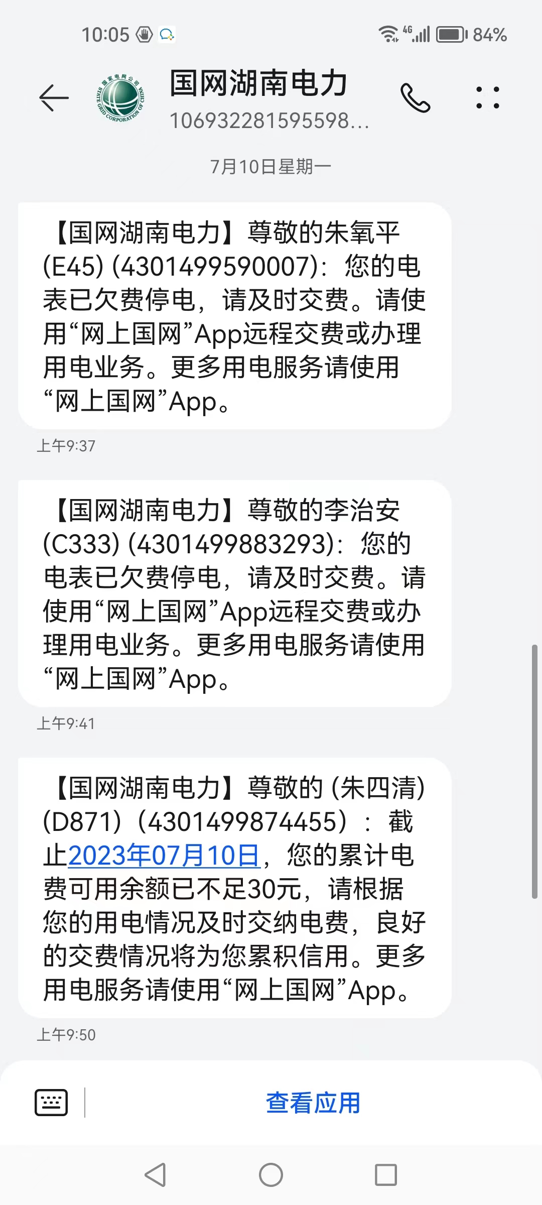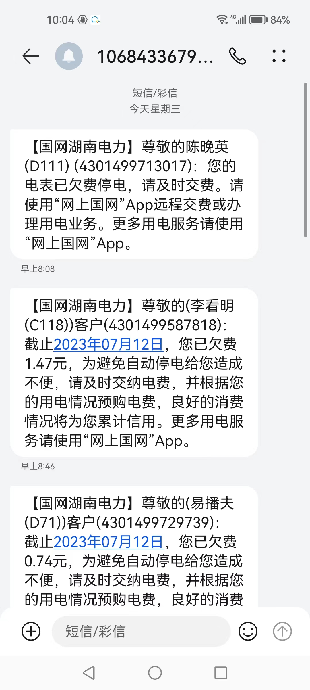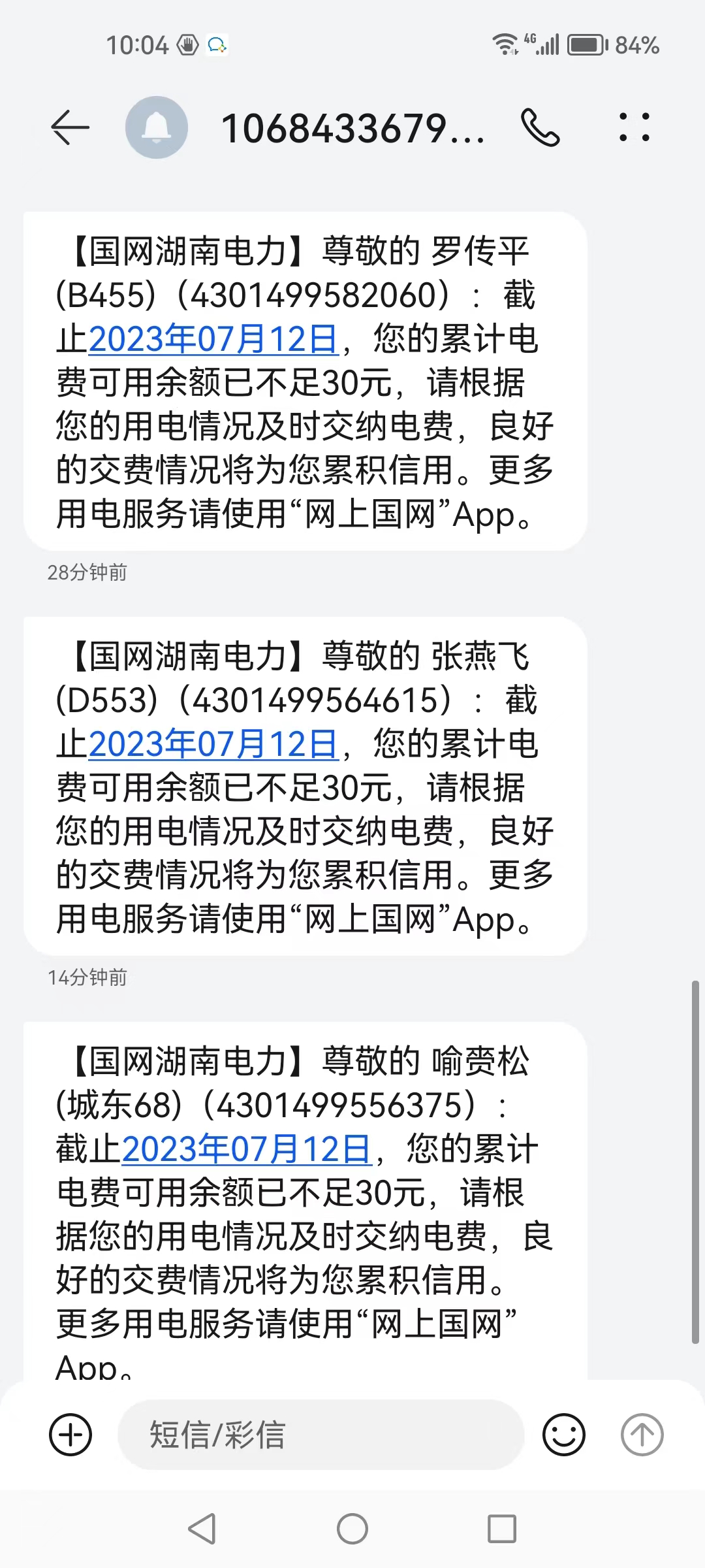 县电力公司将不同客户的联系方式全部设置为我的18390189555的手机号码,导致我的手机每天就是频繁地接受电力报修、送电、停电、客户欠费等各种无关骚扰信息(有图为证),至今已确定张燕飞(D553)、罗传平(B455)、邹雄荪(G74)、青龙庙2楼(A545)、陈晚英(D111)、易播夫(D71)、李看明(C118)、喻赍松(城东68)、朱氧平(E45)、朱四清(D871)、李治安(C333)、毛丰良(A315)、朱献忠(B429)、毛倩兮等等,都是绑定我的手机号码。请电力公司本着以人民为中心、以客户为中心的服务理念,以更加踏实的作风,实事求是地把客户的真实号码确定后改过来,不要让无关客户受尽无谓骚扰。 附件1:237183330.jpg 附件2:355600325.jpg 附件3:419837850.jpg 附件4:541742945.jpg 附件5:659415507.jpg 附件6:1357721510.jpg |