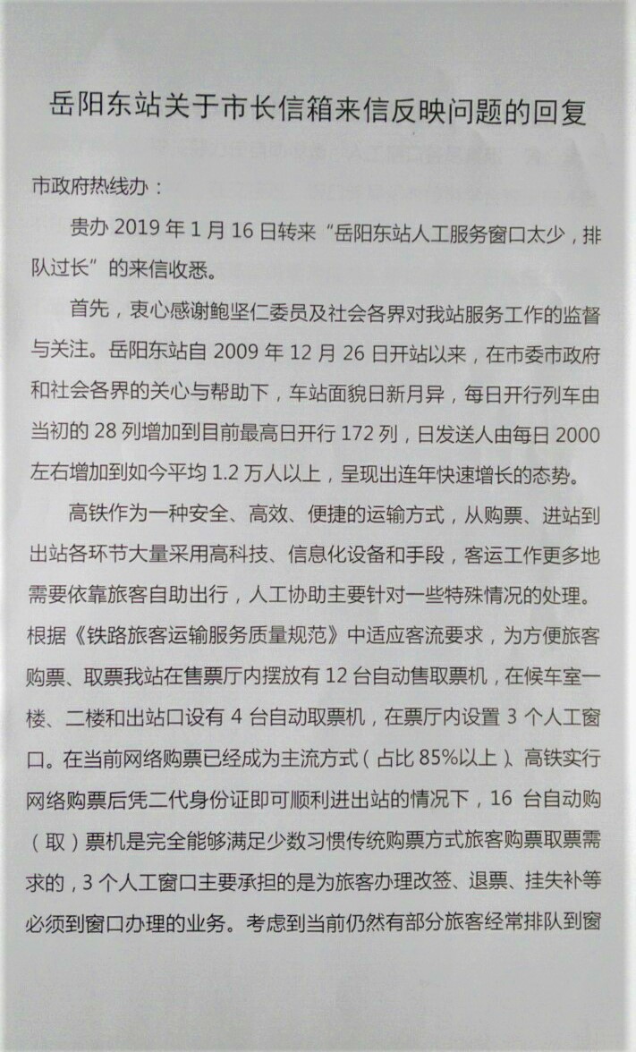 岳阳市政协委员鲍坚仁通过省政协云APP微建议反映:岳阳东站售票处的人工服务窗口很多,但是很多时候只打开一两个,其余窗口使用窗帘遮蔽(做的很隐蔽),导致排队过长,排队一小时并不罕见。现在春运马上开始了,而且天气寒冷,这个情况愈发严重。岳阳东站完全有条件多开人工窗口,希望队伍不超过十人。