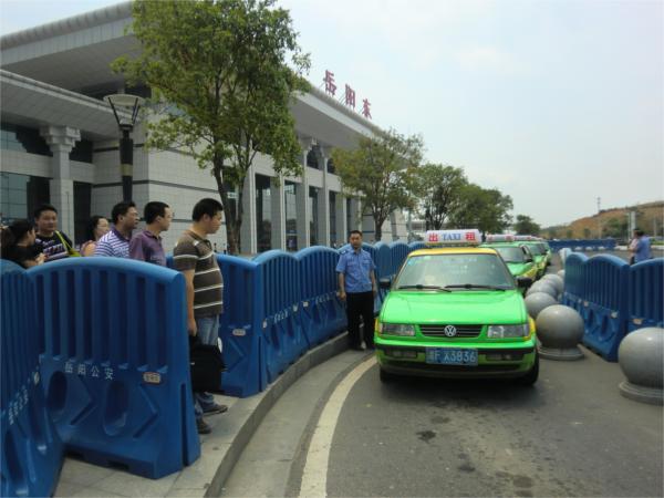 岳阳东火车站于2009年12月正式运营。旅客在岳阳东火车站广场换乘出租车,经历了3个阶段。第一阶段(2009年底至2011年):塑料水马隔离通道,旅客露天候车;第二阶段(2011年至2012年):塑料水马隔离通道,旅客在非常简陋的候车棚候车;第三阶段(2012年年底至今):设置了隔离护栏,修建了比较美观实用的候车通道和候车棚。目前使用的候车棚,经过专门设计,统筹考虑了采光、通风、宣传等多方面因素,方便了旅客候车。通过三张不同时期旅客候车的照片,可以清楚的反映出旅客候车条件的改善。