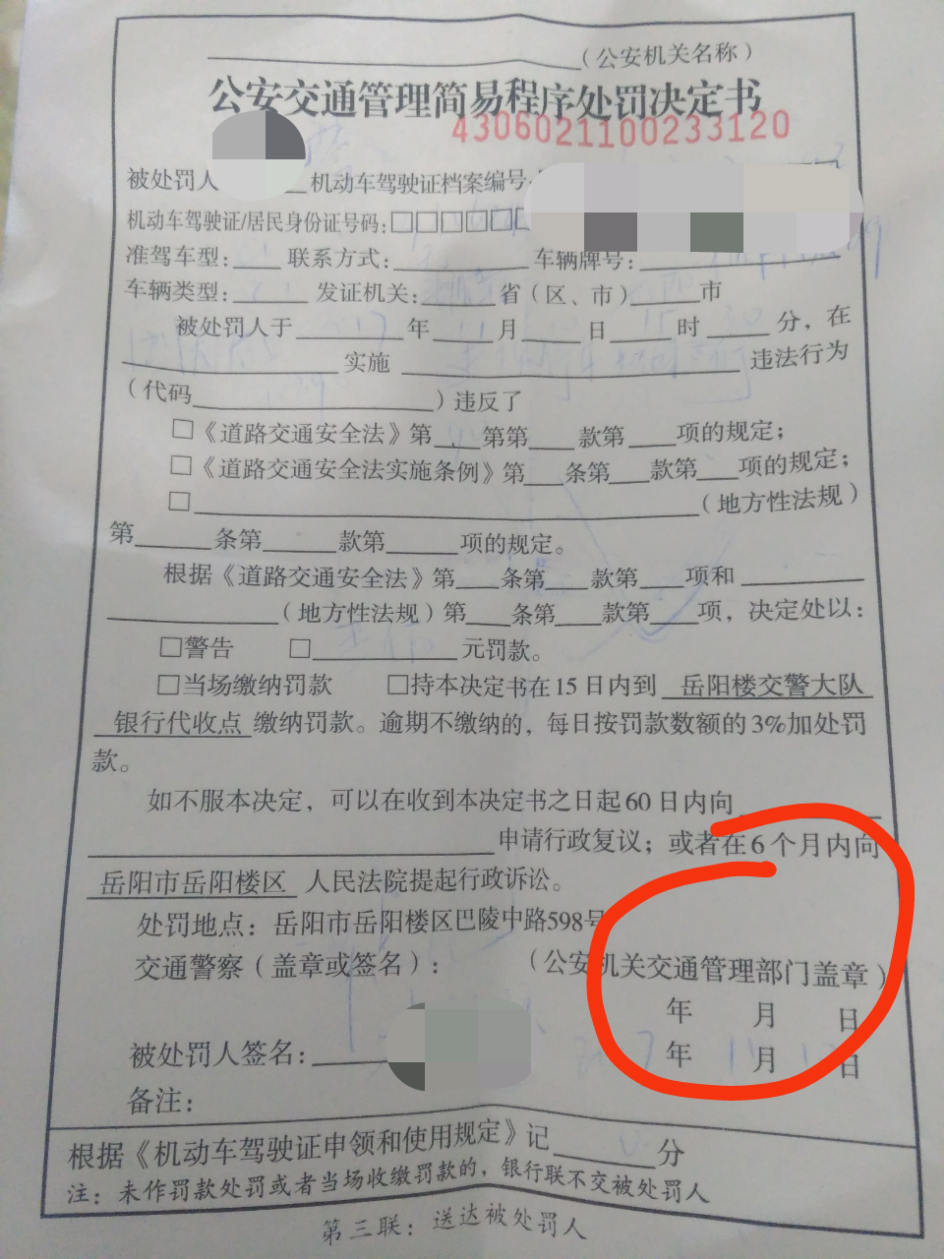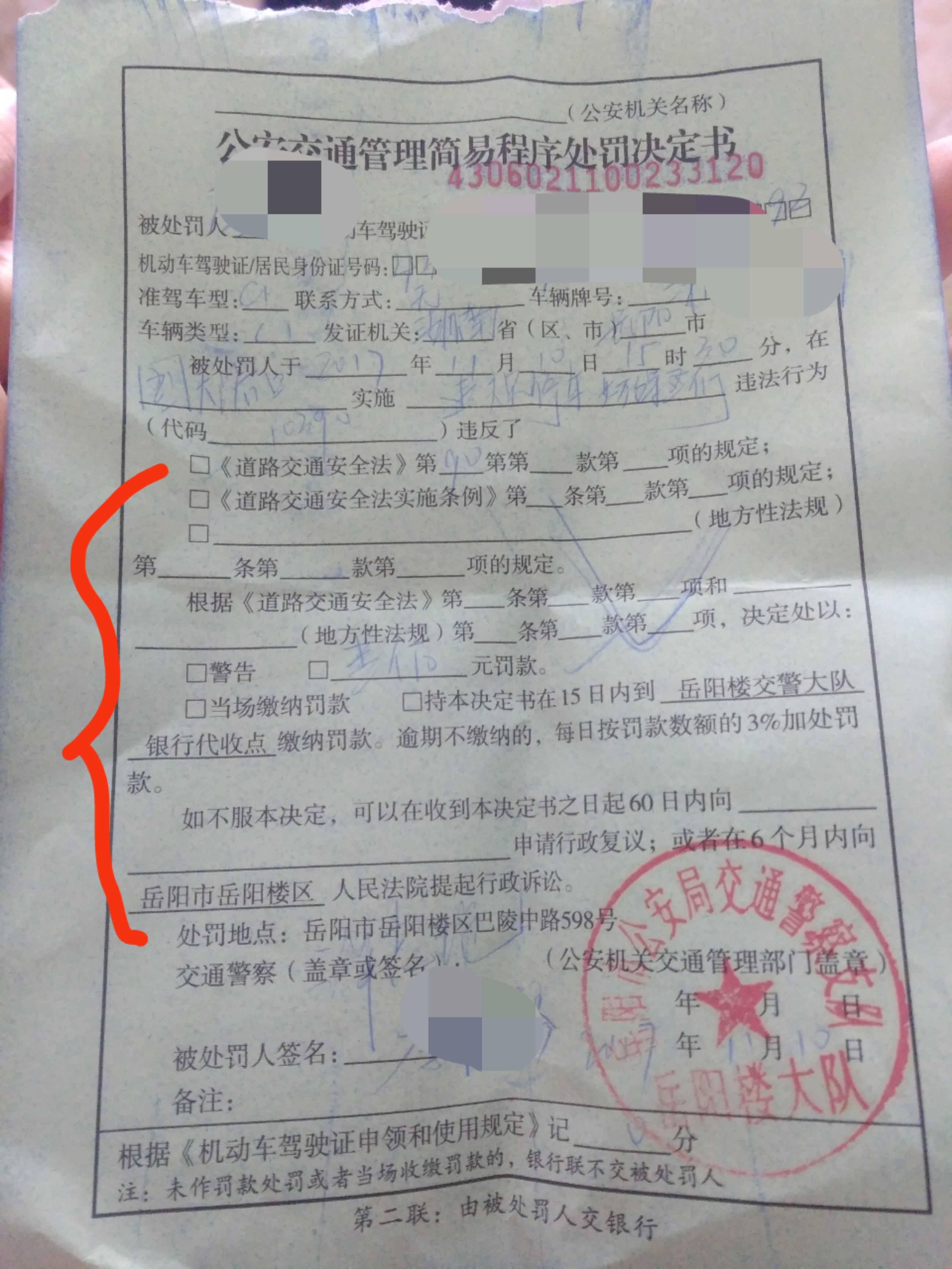 1.执法文书印刷错误。岳阳楼交警大队出具的执法文书违反条款第一条印刷为:《道路交通法》第90第。