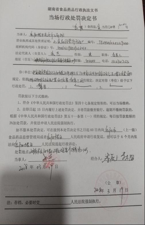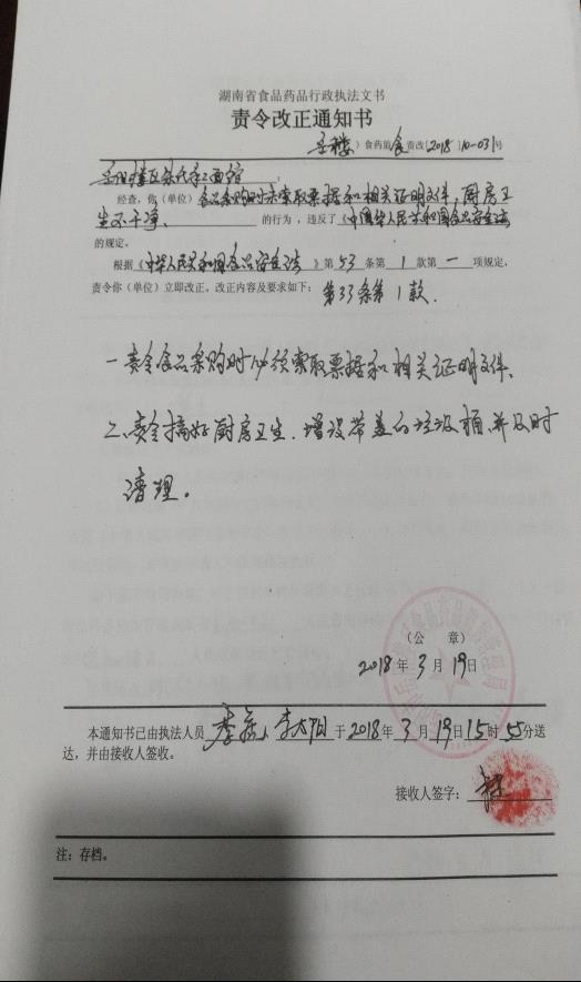 | 回复内容: | 根据《市民来信》(编号:105080)的内容,我们立即到现场进行了核实调查。 经查: 1.该店现场能提供有效的《食品经营许可证》、从业人员健康证明;能提供完整的消毒记录。 2.经现场检查发现该店现场提供的食品进货台帐不齐全,该店的厨房卫生欠干净、整洁。 3.我们现场对该店下达了责令整改通知书和当场行政处罚书(警告处分)。 2018.3.19