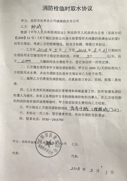 | 回复内容: | 尊敬的姚瑶朋友: 您好!您发布的关于“工地私接消防栓用水”的信件我公司已收悉,现经岳阳市自来水公司办公室核实处理后,回复如下: 收到您的举报来信后,我公司十分重视,第一时间派稽查人员进行了核实,确认“青年中路理想城”相关人员及单位已与我公司签订了从2018年5月1日至2018年8月31日的《消防栓临时取水协议》,不属于违章用水。 在此,非常感谢您对市政用水和我公司的大力支持,也欢迎您在今后继续举报相关违法行为。 特此回复 岳阳市自来水公司 |
